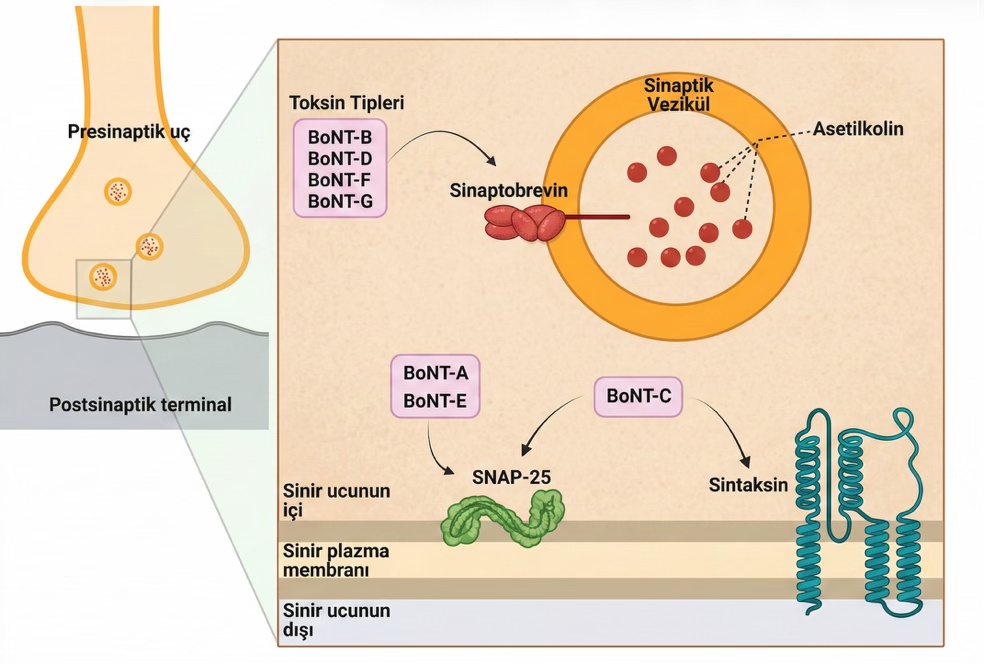 Botulinum nörotoksinleri (BoNT’ler), Clostridium cinsine ait anaerob ve spor oluşturan bakteriler tarafından üretilen güçlü nörotoksinlerdir. Klasik olarak A-G arası 7 serotipe ayrılır. Bazı serotipler (A, B, E, F; muhtemelen G ve H) insanlarda botulizme neden olurken, C ve D daha çok hayvan botulizminden sorumludur. Ayrıca yalnızca C. botulinum değil; C. butyricum, C. baratii ve C. argentinense gibi diğer Clostridium türleri de BoNT üretebilir. Çevresel baskılar ve genetik rekombinasyonlar sonucu kimerik toksinler (örneğin BoNT/CD, BoNT/FA) ortaya çıkmış ve varyant sayısı giderek artış göstermiştir. Günümüzde rekombinant teknoloji ile yeni BoNT’ler de tasarlanabilmektedir. BoNT’ler, Botulinum toksini, kas ile sinir arasındaki bağlantı noktasında (nöromüsküler kavşak) sinirin kasa kasılma emri göndermesini engeller. Normalde sinir ucu, kasın kasılmasını sağlamak için asetilkolin adlı bir kimyasal madde salgılar. Botulinum toksini bu maddenin salınmasını durdurur. Asetilkolin salınamayınca kas kasılamaz ve gevşek kalır. Bu nedenle kaslarda gevşek (flask) paralizi, yani kasın tamamen güçsüz ve sarkık hale gelmesi ortaya çıkar.
